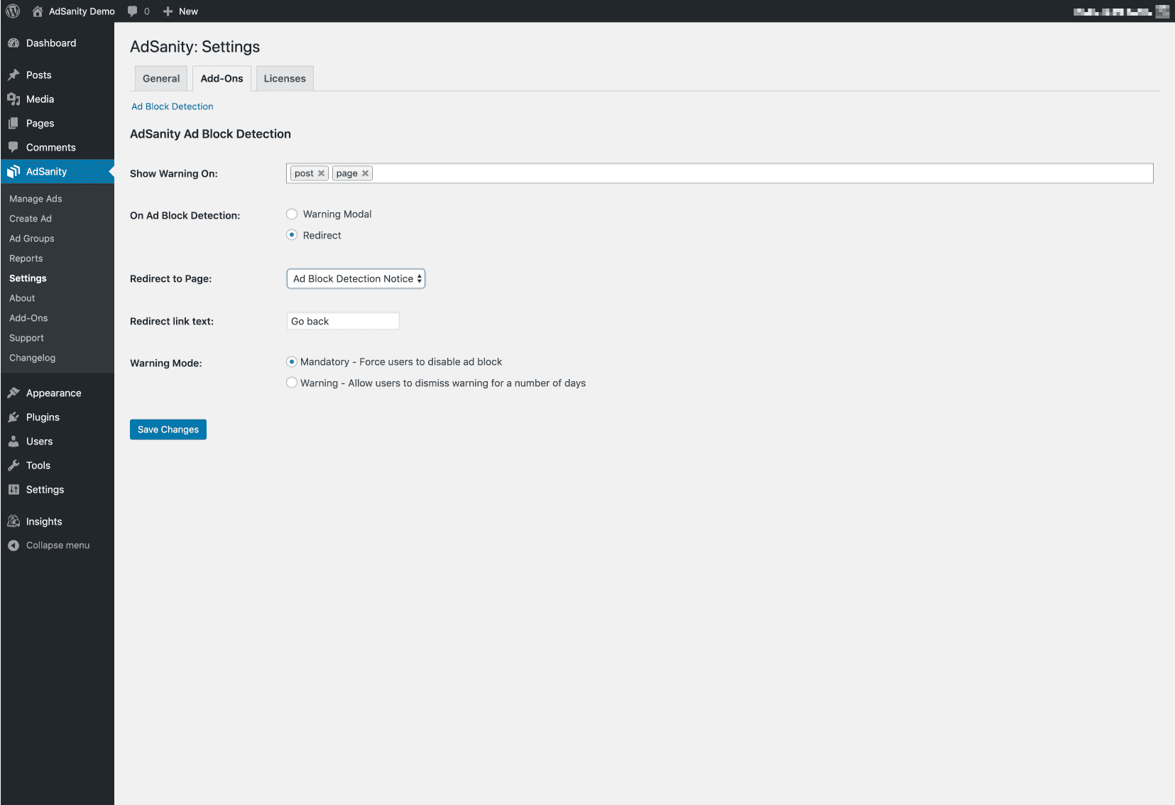 The Ad Block Detection Add-On allows the AdSanity administrator to give feedback to visitors of their AdSanity powered websites who are running an ad blocker on their browser. We always recommend trying to follow the wishes of visitors to your website, however, your advertising is where you make your revenue. You can now let visitors know that in order to enjoy the content you’re providing they’ll need to disable their ad blockers.